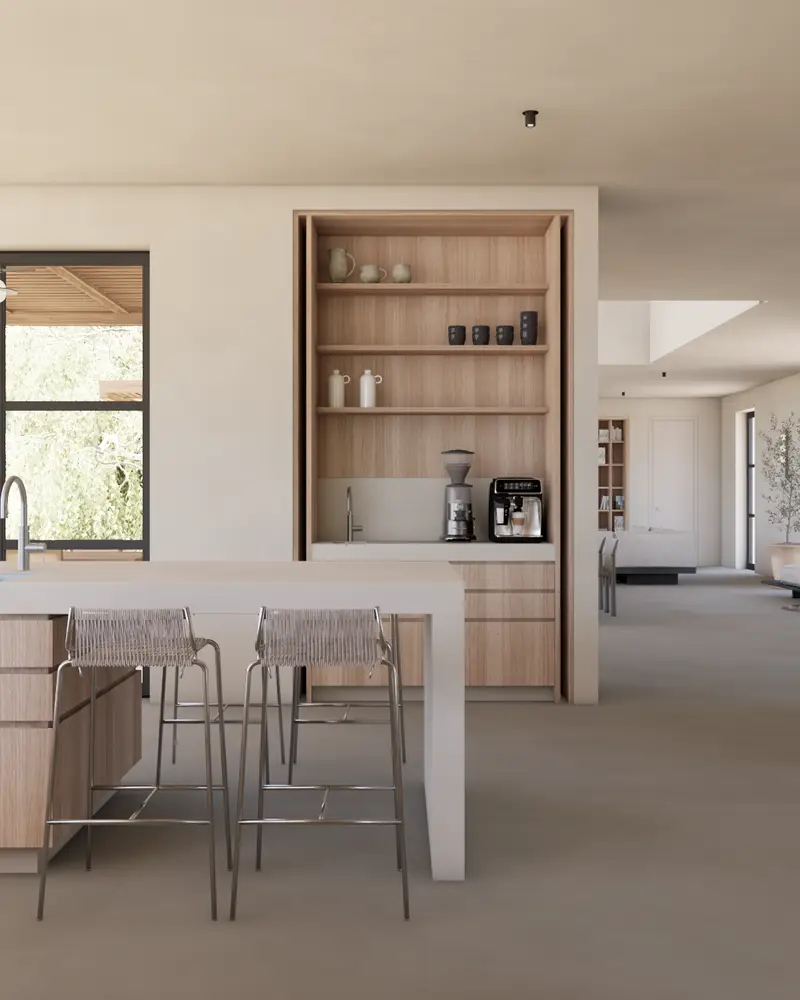 Our Contribution: Complete planning of architecture and interior design. All built-in furniture custom-designed as bespoke pieces – precisely tailored to spatial qualities and material palette.