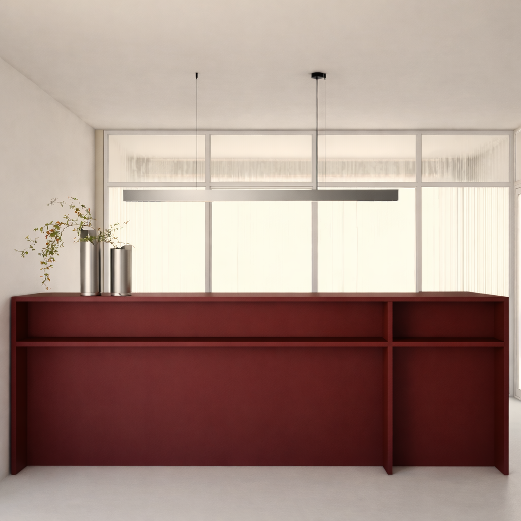 Das Materialkonzept basiert auf natürlichen Oberflächen wie Holz, Linoleum und textilen Elementen in hellen Beigetönen. Diese Kombination erzeugt eine ruhige, wohnliche Atmosphäre. Eine dunkle Burgundy-Nuance zieht sich als Leitfarbe durch die Praxis und setzt gezielte gestalterische Akzente, insbesondere im Empfangsbereich als zentralem Blickfang.
